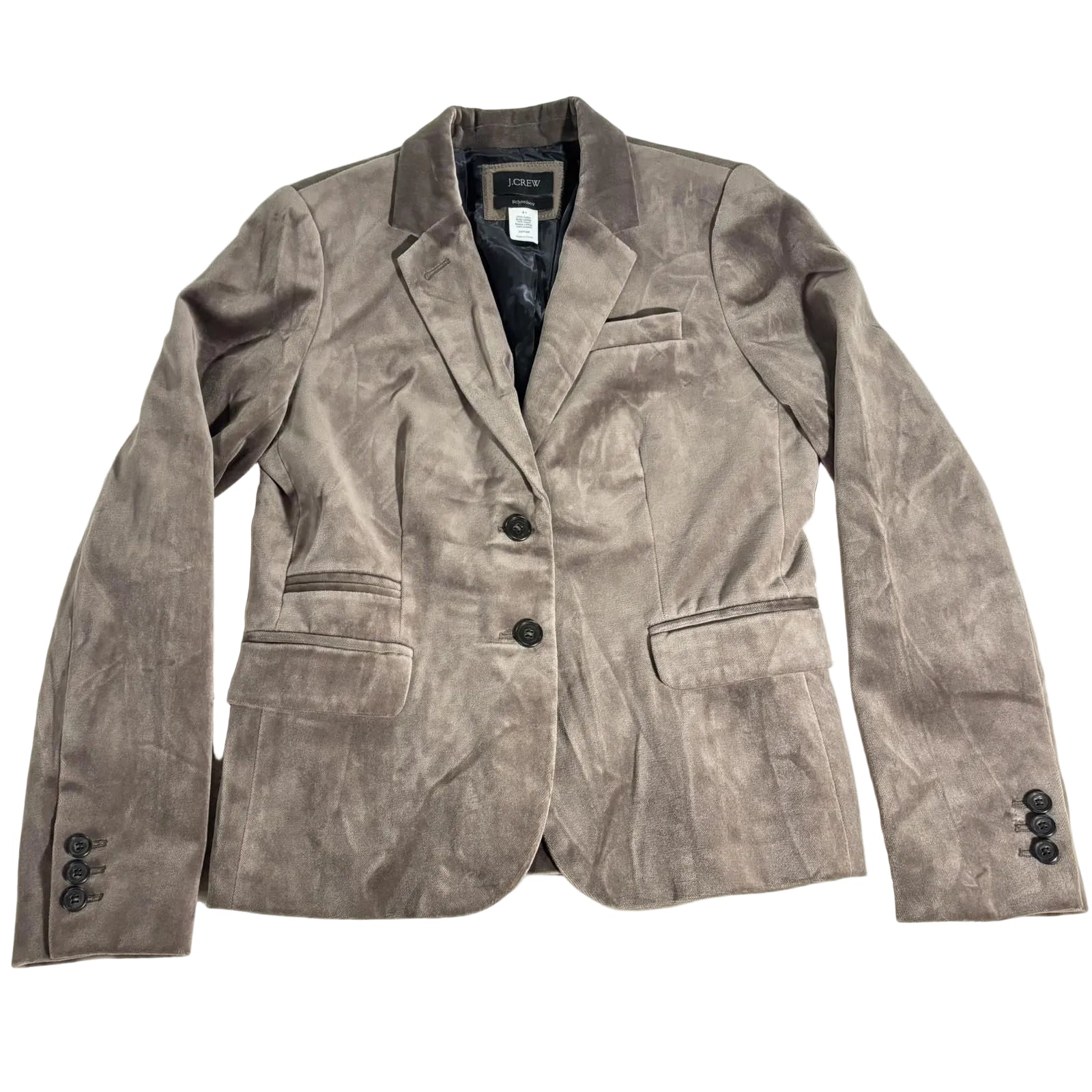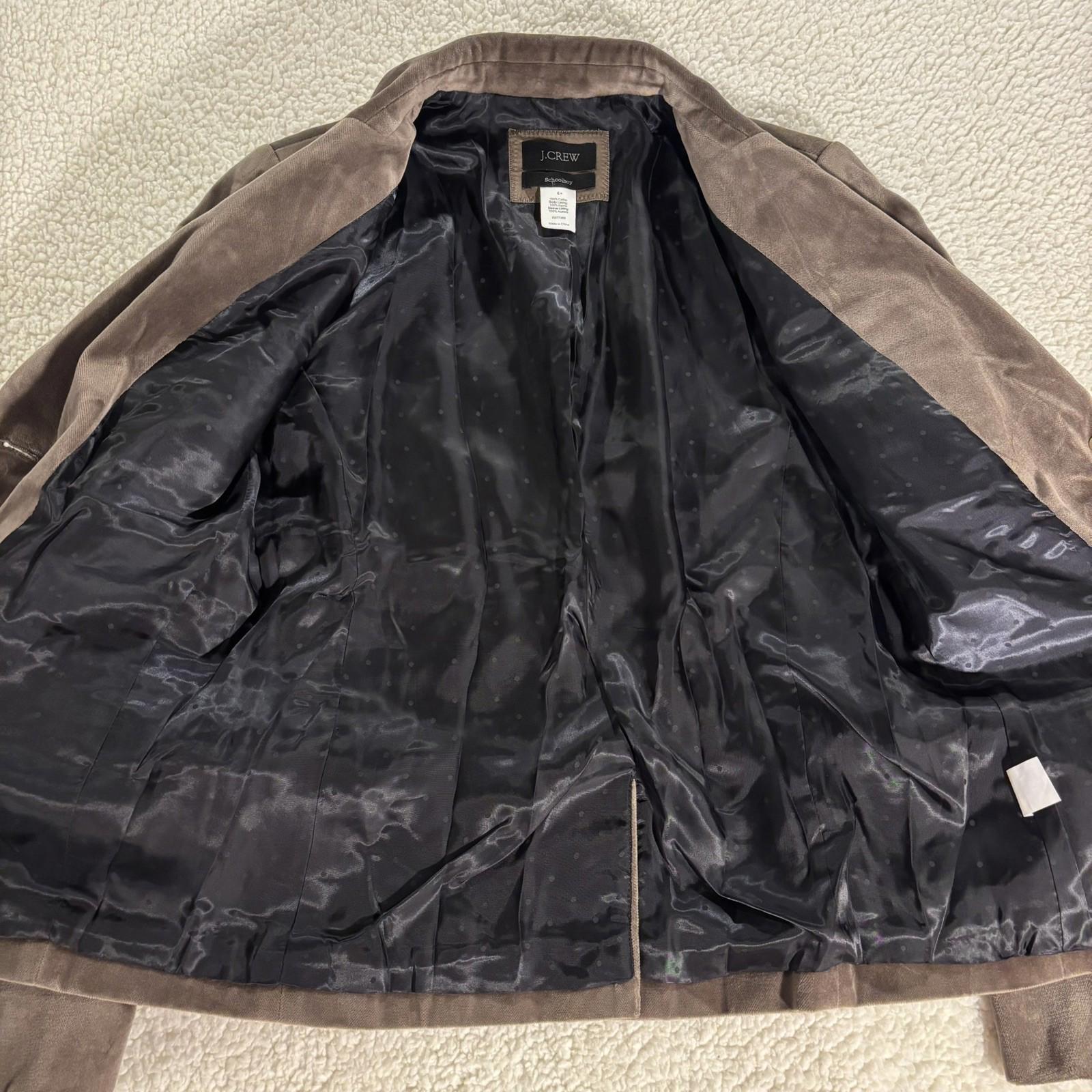 J. Crew Velvet Schoolboy 2 Button Blazer SZ 6 Workwear Classic Preppy Taupe. Perfect Mousy Brown / Taupe Color. EUC. Lining has a Dot Pattern. Measurements are in the Photos. Thank you.